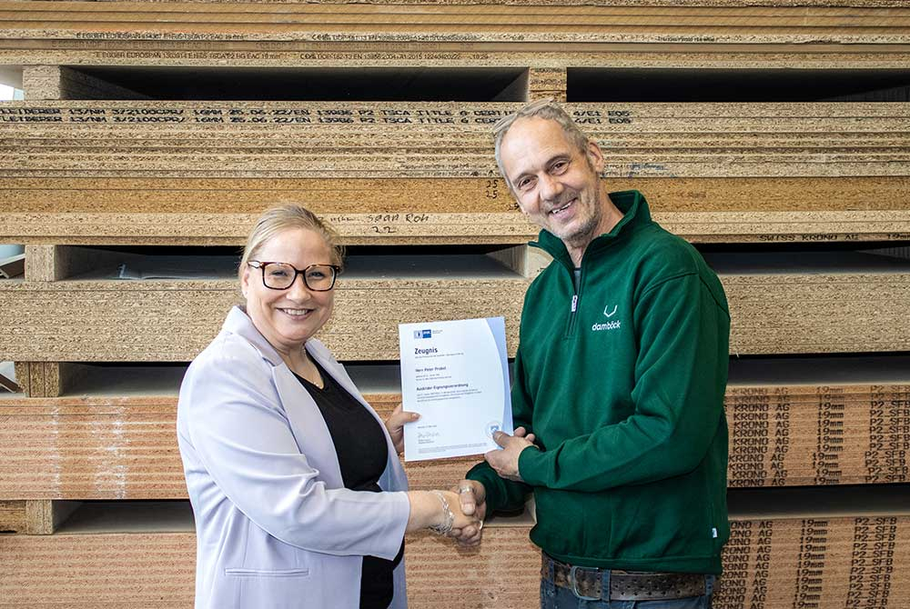 Bild: Rebecca Vogel (Leiterin Betriebsorganisation) gratuliert dem neuen IHK Ausbilder Peter Probst (Schreiner/Bauleiter).