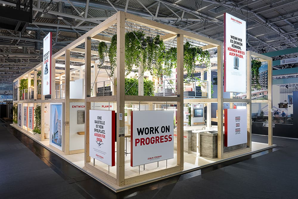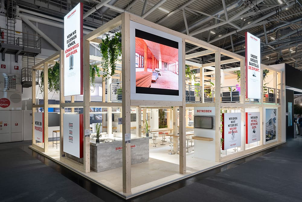 Der Messestand von STRABAG auf der Expo Real in München präsentiert sich als eindrucksvolles Beispiel für zukunftsorientierte Architektur. Mit seiner offenen, lichtdurchfluteten Struktur aus nachhaltigen Materialien wie Holz und begrünten Elementen wird das Thema "Erlebbare Nachhaltigkeit" direkt erkennbar und unterstreicht das Ziel des Unternehmens, CO2 aktiv zu reduzieren.